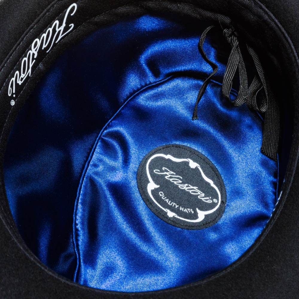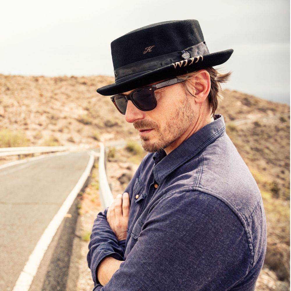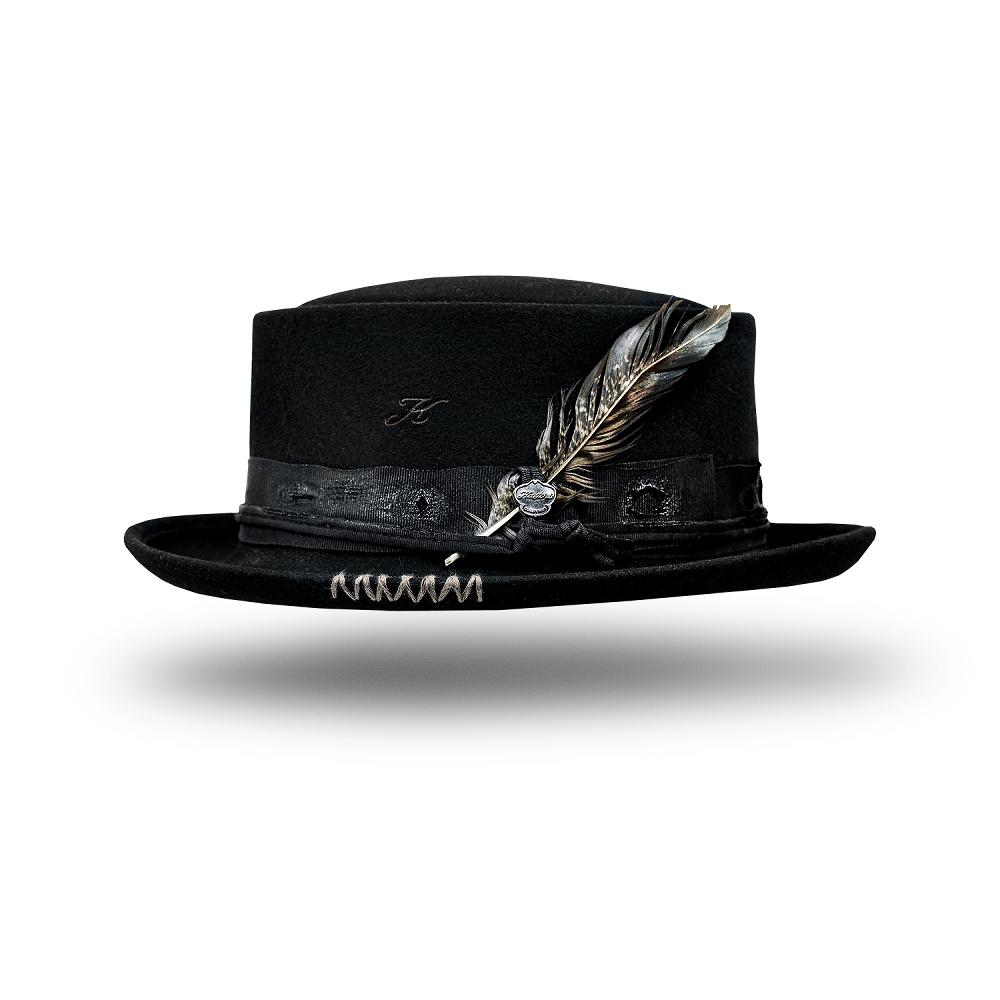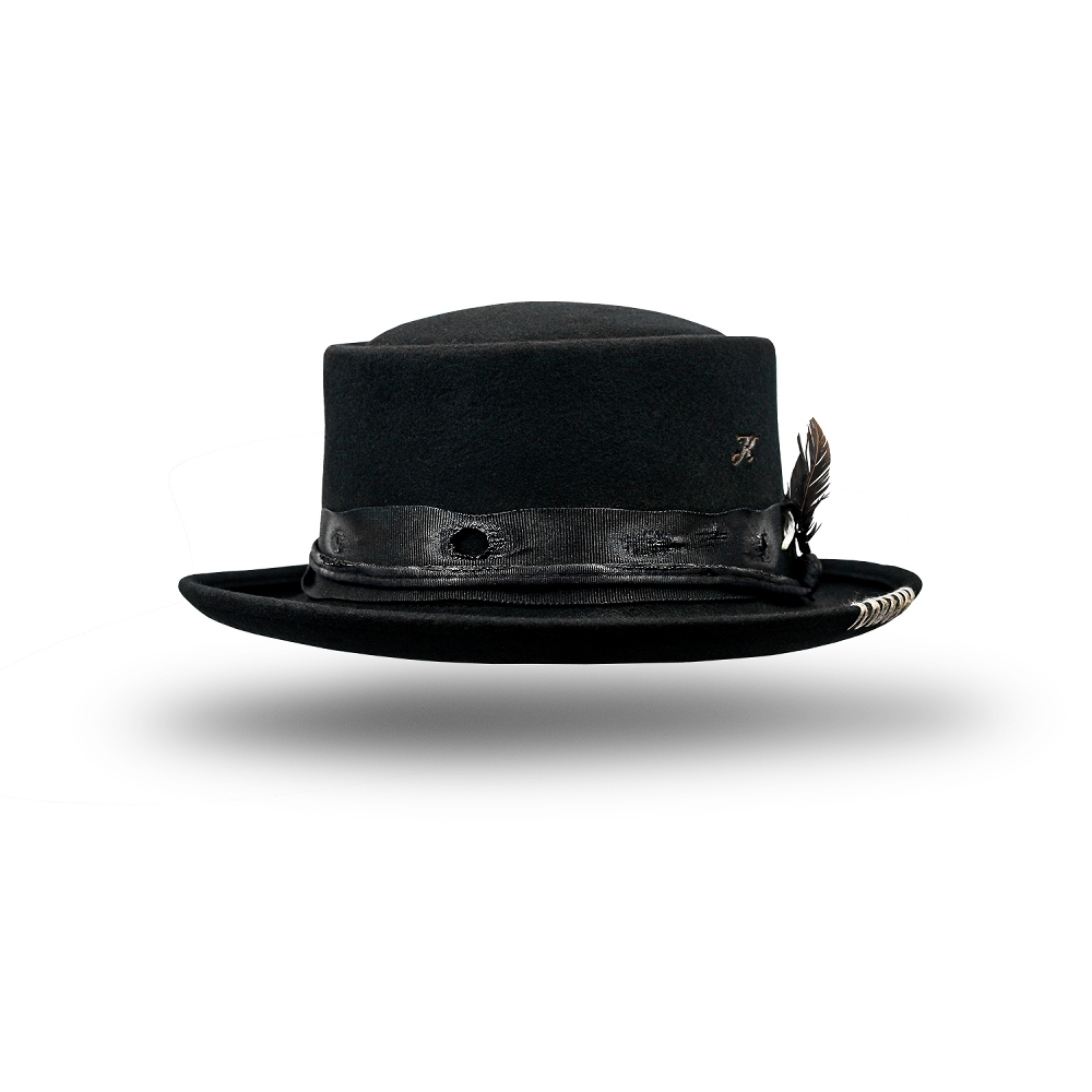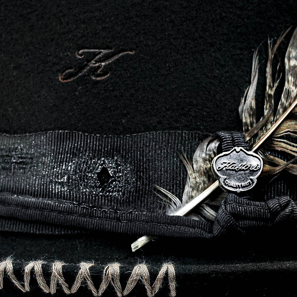 Das Logo-Branding vervollständigt den einzigartigen Look des Hutes, die Feder kann am Hutband befestigt werden.