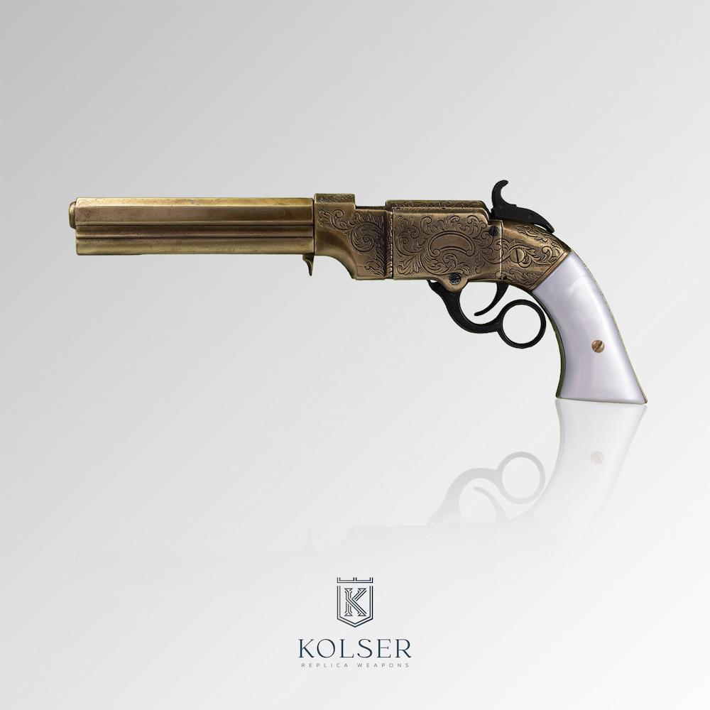 Die Kolser-Replik der Volcanic-Pistole von 1854 erweckt eine der innovativsten Waffen des 19. Jahrhunderts wieder zum Leben. Mit ihrem charakteristischen achteckigen Lauf und einem ihrer Zeit voraus seienden Design setzte die Volcanic-Pistole einen Meilenstein in der Entwicklung von Schusswaffen und wurde zum Vorbild für die ersten Repetiergewehre. Aus Metall gefertigt, mit gravierten Details und Griffschalen aus hochwertigem Kunststoffharz, fängt unsere Version die Essenz eines echten Sammlerstücks ein.