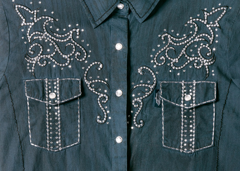 Bluse Maya von StarsandStripes: Westernbluse im individuellen Fade-Out-Look mit Stickerei, Ziernähten, Strasssteinen und funkelnden Druckknöpfen. Mit einer Lasche zur Ärmelfixierung.