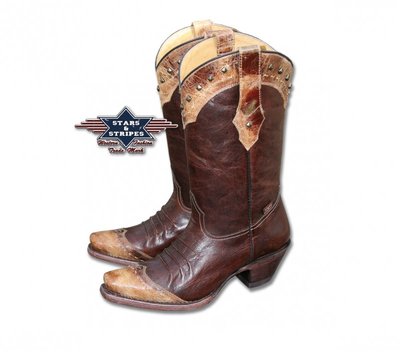 Damenwesternstiefel WBL-28: braune Westernstiefel mit fantastisch hell abgesetzten Schattierungen. Innensohle, Innenfutter, Absatz und die gemusterte Laufsohle sind aus hochwertigen Rindsleder, nach mexikanischer Bootmaker Tradition von Hand gefertigt, rahmengenäht und im hochwertigen Goodyear-Verfahren aufgezogen.